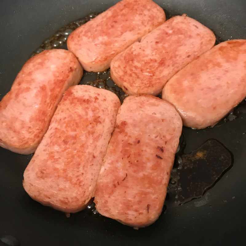 1.スパムは6等分に切り、フライパンで焼く。