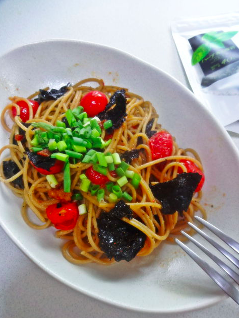 お届け物!ハーブ海苔と焼きトマトのシンプルパスタ